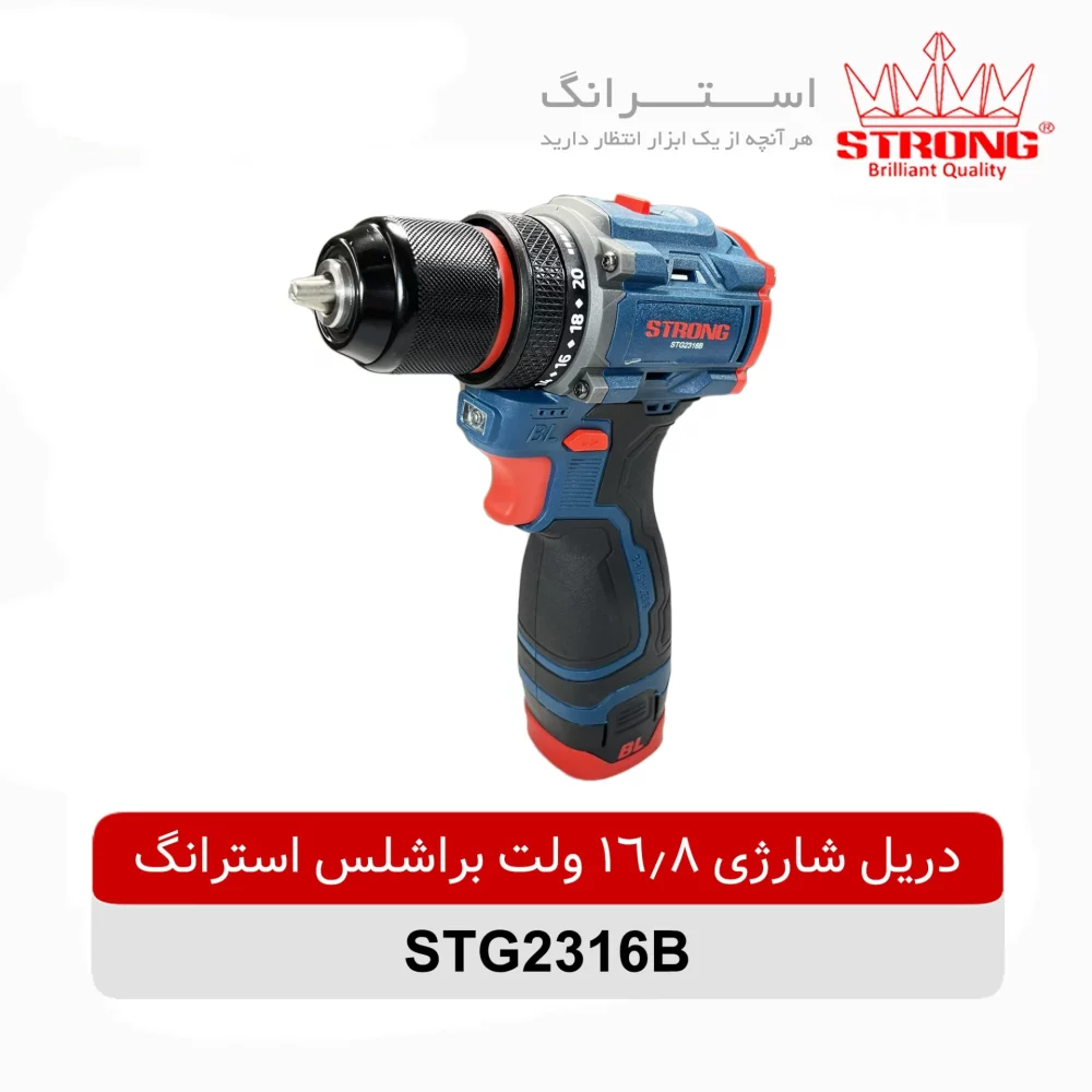 دریل شارژی براشلس 16.8 ولت استرانگ مدل STG2316B دارای دو باطری 2 آمپر 16.8 ولتی میباشد. این دریل براشلس از سه نظام 10 میلیمتری بهره میبرد، همچنین قابلیت دوسرعته بودن از ویژگی های این محصول میباشد. در ادامه به برخی از ویژگی ها و مزایای دریل های براشلس می پردازیم: