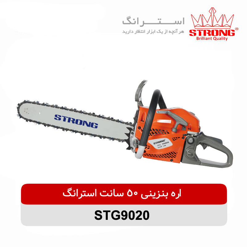 اره بنزینی 50 سانتی متر استرانگ مدل STG9020 دارای قدرتی معادل 2100 وات و حجم موتوری برابر 49.3 سی سی میباشد. حجم مخزن این اره بنزینی استرانگ 550 میلی لیتر و میزان اختلاط روغن و بنزین این دستگاه 40 به یک میباشد. کاربراتور حرفه ای دیافراگمی با سوپاپ های دوار و سیستم ضد لرزش از ویژگی های اره بنزینی 50 سانتی متر استرانگ مدل STG9020 است. موتور این اره از نوع تک پیستون هوا خنک میباشد و سرعت چرخش در حالت آزاد این اره برابر 3600 دور در دقیقه میباشد.