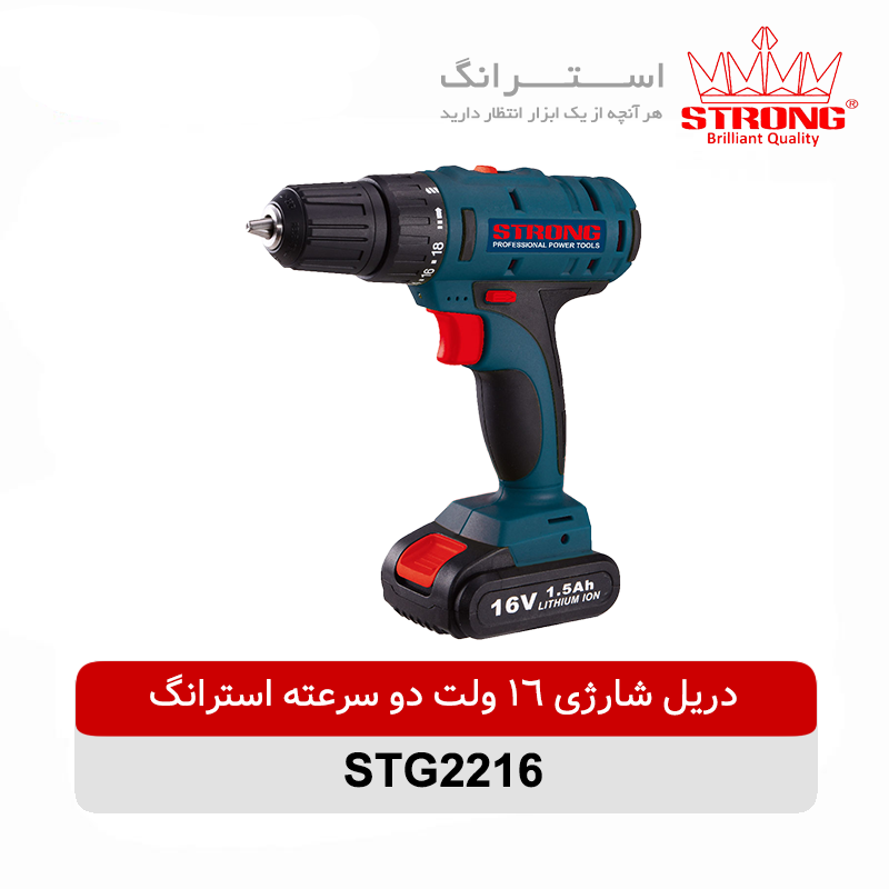دریل شارژی 16 ولت دوسرعته استرانگ مدل STG2216 یکی از بهترین دریل های شارژی شرکت استرانگ میباشد، این محصول دارای باطری 1/5 آمپر لیتیوم یون میباشد و حداکثر گشتاور برای این دریل 26 نیوتن متر است. قابلیت تغییر سرعت چرخش در حالت آزاد در دو محدوده‌ 400-0 و 1500-0 دور در دقیقه با توجه به شرایط مختلف استفاده برای دریل شارژی 16 ولت استرانگ مدل STG2216 قابل تنظیم است. کلید گازی ضد غبار، کلید کنترل سرعت دو حالته، کلید چپ‌گرد / راست ‌گرد و چراغ قوه ال ای دی از ویژگی های این دستگاه میباشد.