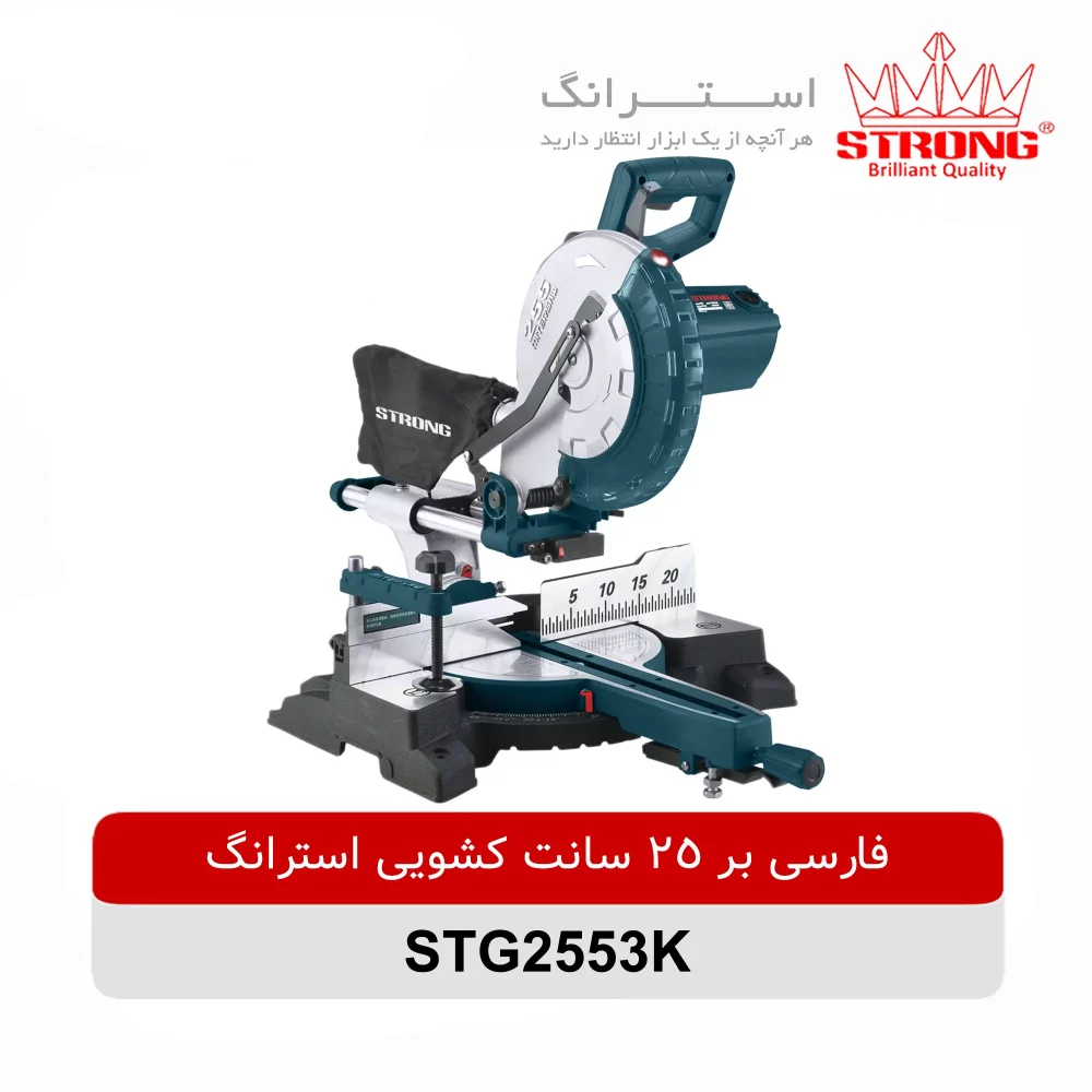 اره فارسی بر کشویی 250 میلیمتر یا 25 سانتی متر استرانگ مدل STG2553-K دارای قدرت موتوری برابر 2200 وات میباشد این فارسی بر مجهز به لیزر جهت برش دقیق است و دارای سیستم برش کشویی جهت افزایش دامنه برش میباشد قابلیت برش اریب 45 درجه چپ از ویژگی های این دستگاه  به شمار میرود و سرعت گردش دیسک در حالت آزاد برابر 5000 دور در دقیقه میباشد.