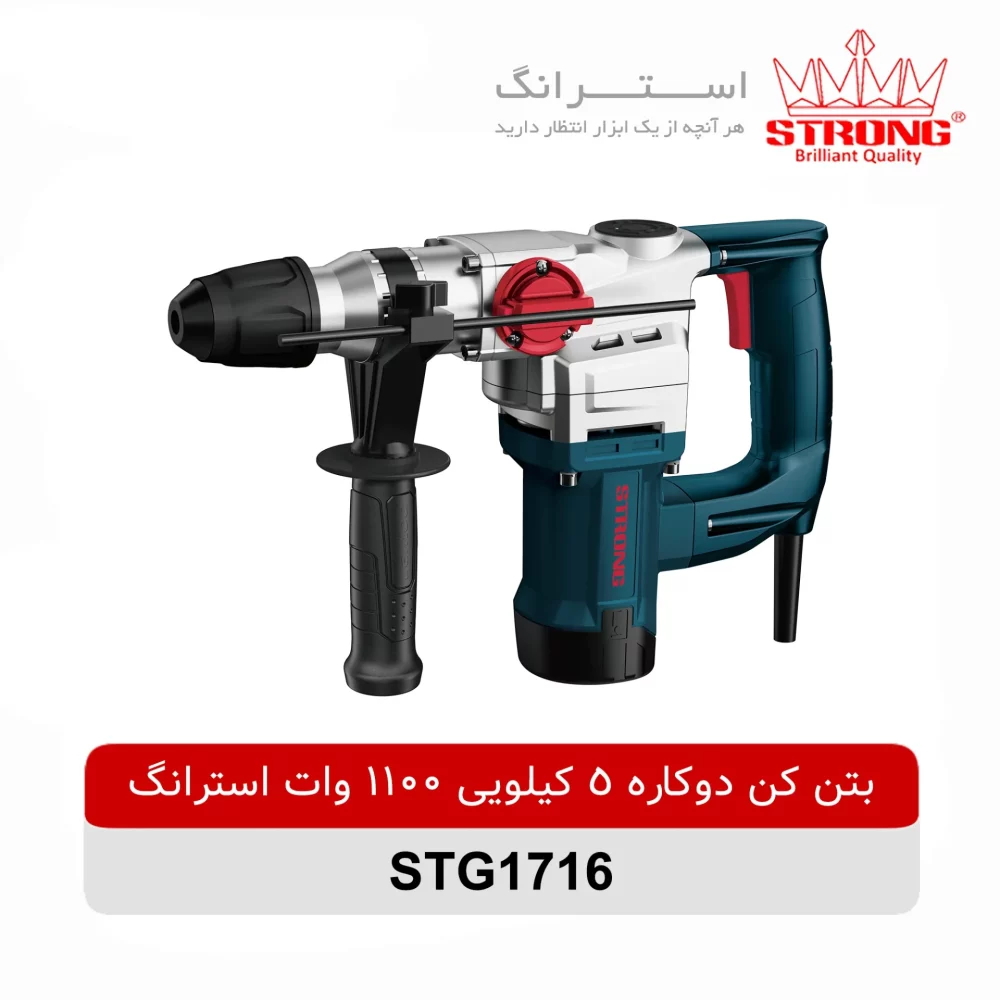 بتن کن دو کاره 5 کیلویی 1100 وات استرانگ مدل STG1716 دارای قدرتی معادل 1100 وات است و در فرکانس کاری 50 هرتز و ولتاژ 220 ولت کار میکند. قدرت ضربه برای این محصول 4300 bpm تعریف شده و سرعت چرخش برای این بتن کن استرانگ برابر 1080 دور در دقیقه است. موتور بتن کن دو کاره 5 کیلویی 1100 وات استرانگ مدل STG1716 با آرمیچر های با کیفیت و 100% مسی مطابق استاندارد CE اتحادیه اروپا نخ بندی شده است. دسته کمکی این محصول قابلیت چرخشس 360 درجه ای را دارا میباشد همچنین مجهز به کلید راست گرد و چپ گرد میباشد. این محصول دارای کیف بی ام سی و لوازم جانبی دیگر میباشد.